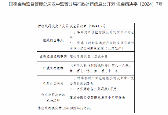 12月13日金融一线音尘开云kaiyun官方网站,国度金融监督处治总局汉中监管分局行政处罚信息公开表表露,华泰财产保障有限公司汉中中心支公司因虚列专属代理门店行状费被罚金14万元,张炜(时任华泰财产保障有限公司汉中中心支公司副总司理(主捏责任)被劝诫并罚金1万元。