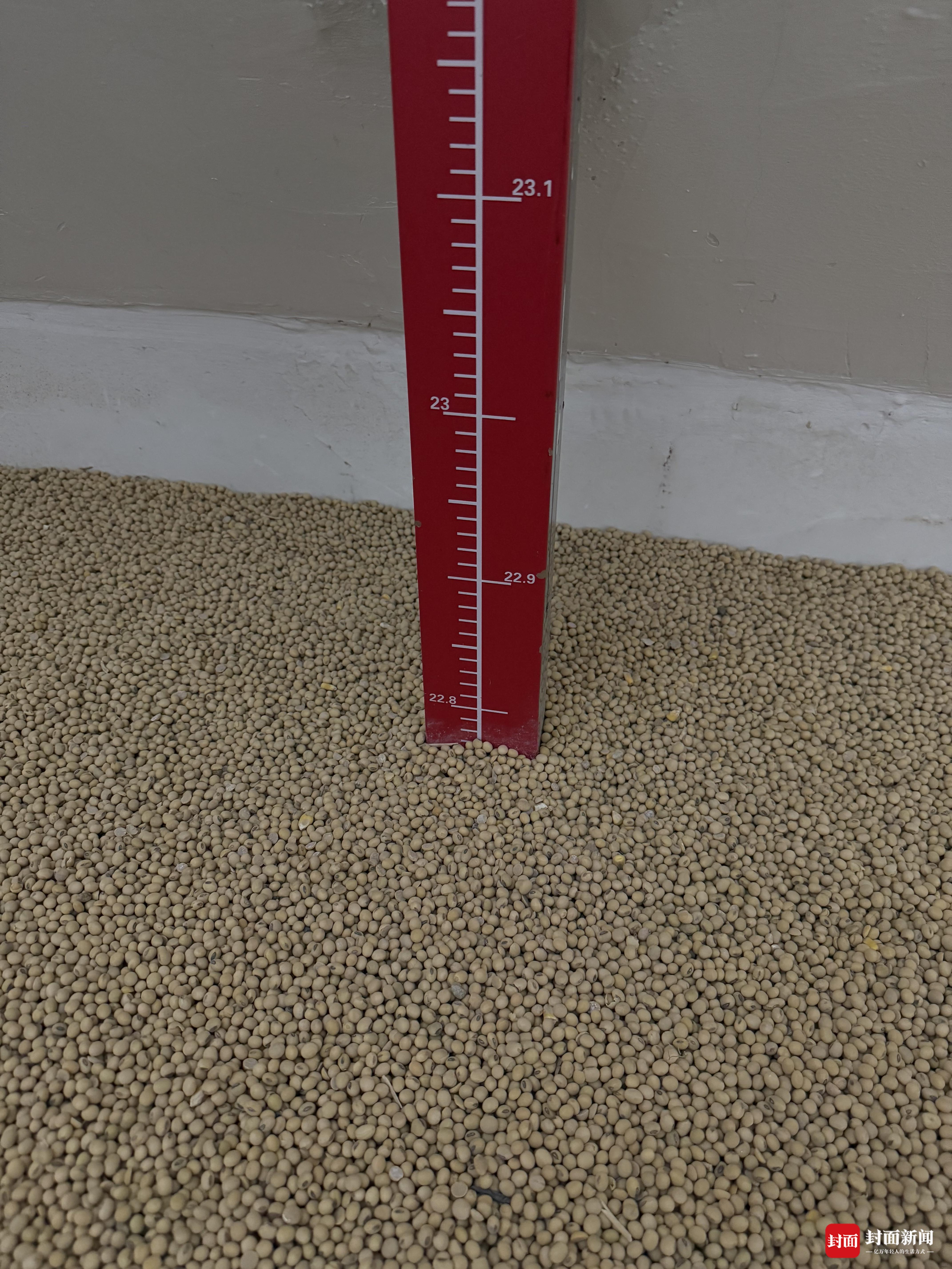 随后,记者奴隶仓储科认真东说念主吴晓光插足到一座气膜仓内。“这批大豆是2023年8月入仓的,一共7500吨,现时储存情况致密。”他先容,当今仓内温度是22℃,湿度73度,粮堆高度22.7米,占大地积终点于一个法子篮球场大小。通过仓顶轴运动风口、当然透风口来进行透风换气;同期还有25根测温电缆,底下漫衍着350个测温点位,及时监测食粮温度。