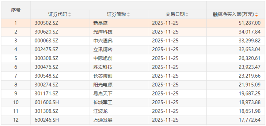 个股方面开云kaiyun,25股获融资净买入额超1亿元。新易盛获融资净买入额居首,净买入5.13亿元;融资净买入金额居前的还有光库科技、中兴通讯,、立讯精密、中际旭创、胜宏科技、长芯博创、阳光电源、易点六合、长城军工等。